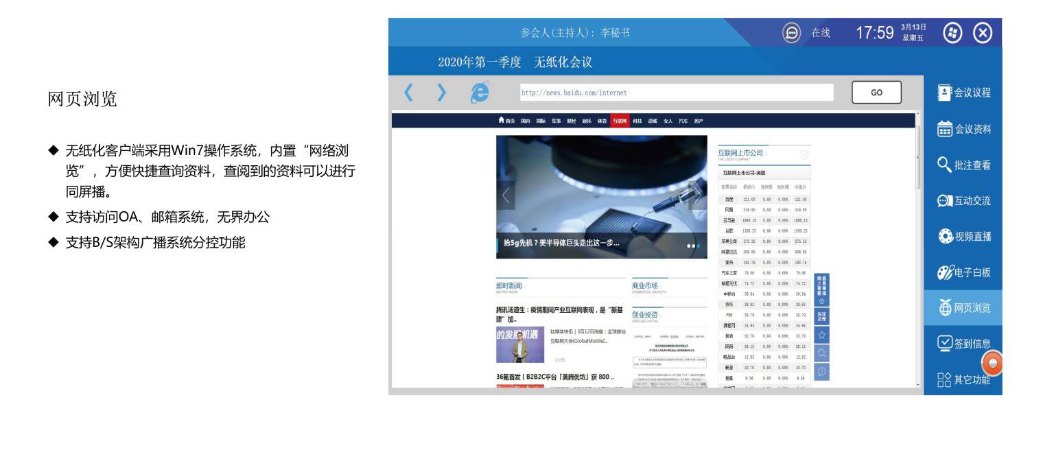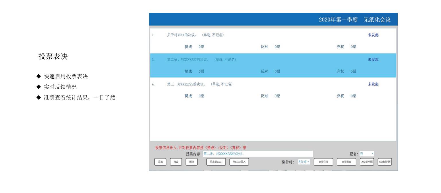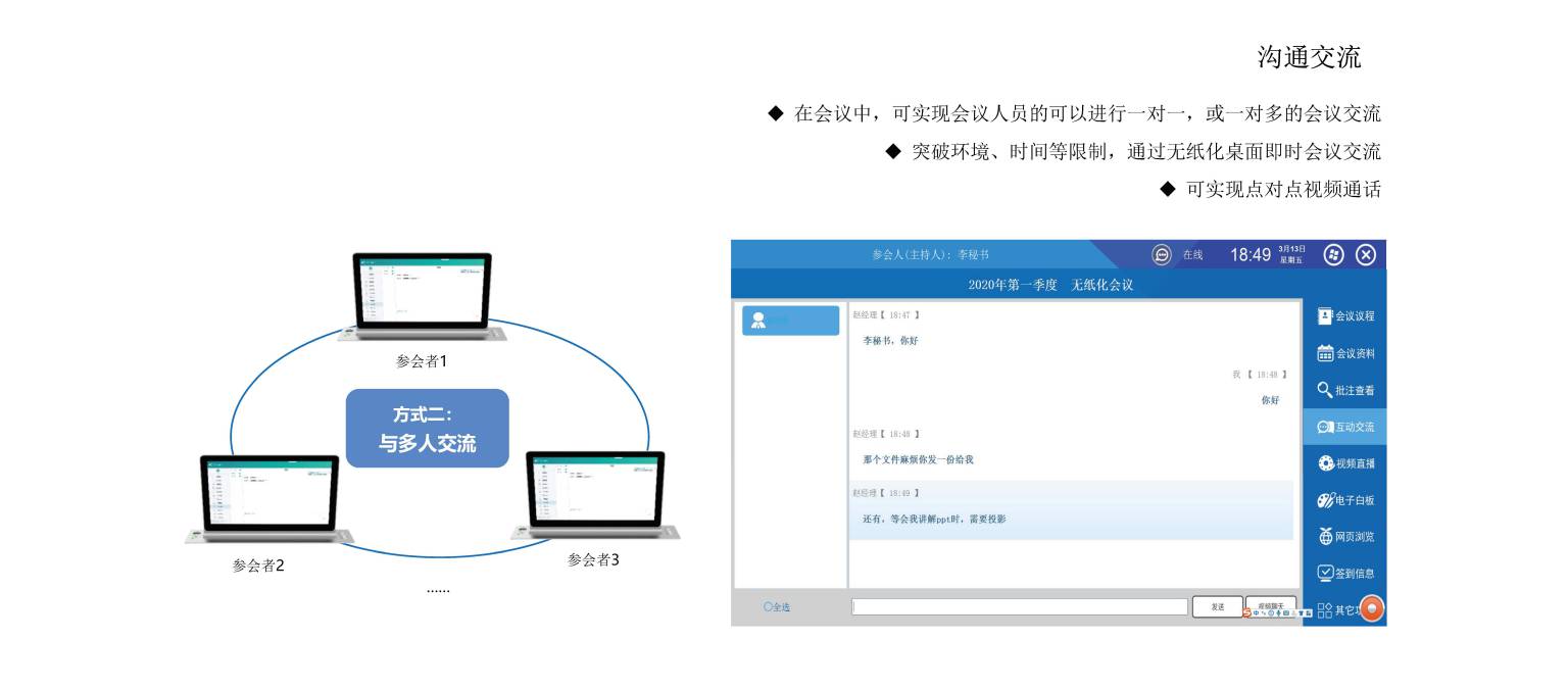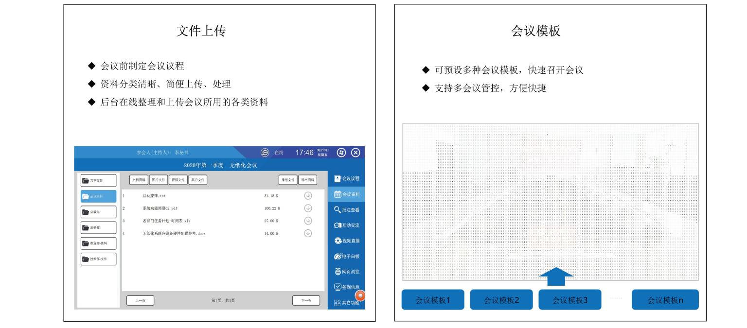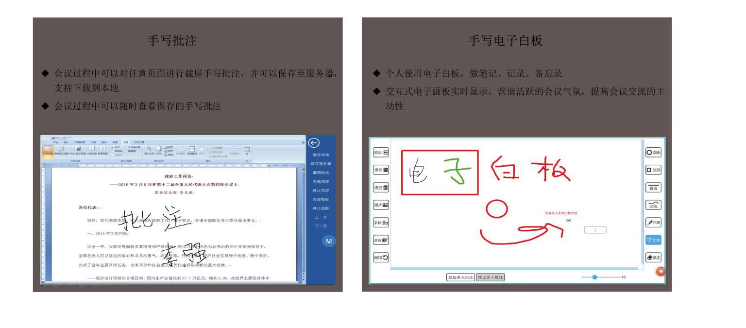 软件开发 智能化 信息化 数字化展厅 无纸化会议系统 无纸化系统,提供丰富的会议功能,协助会议主办方对整个会议流程进行高效便捷的控制,覆盖会前、会中、会后全部流程,提供高品质会议服务,系统支持会议签到,表决投票、上网、短消息通知、电子白板、手写批注、主持功能、中控功能等多项常用会议功能集成助力实现会议无纸化。广泛用于政府、检察院、电网、水利局等国家政府部门会议室。 功能介绍: