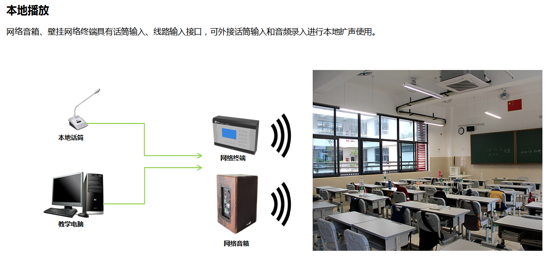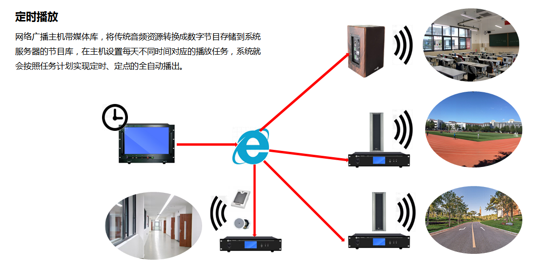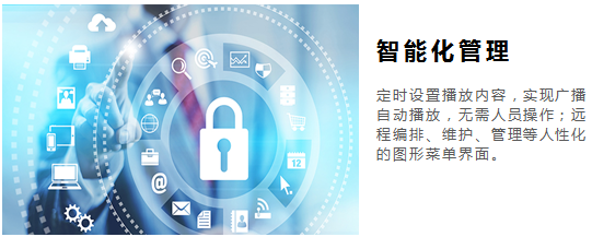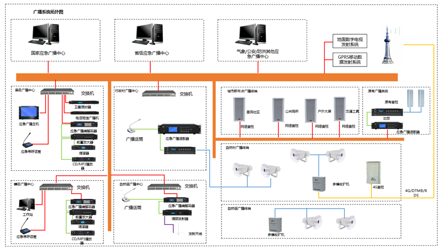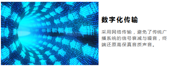 公共广播系统利用TCP/IP协议、4G、RDS、DTMB等方式传输,采用现有的信号传输系统来建设,无需重新布线。基于TCP/IP协议、4G、RDS、DTMB等传输方式,, 将音频信号以数据的形式在局域网和广域网上进行传送。公共广播具有双向对讲、定时播放、电话短信广播、分区广播、实时采集、终端录音、终端地图等功能。相对于传统模拟广播,数字网络广播具互动性、管理方便、传输距离远、安装方便等特点。公共广播系统广泛应用于学校、高铁站、楼宇大厦、商场、机场、公园景区、监狱等场所